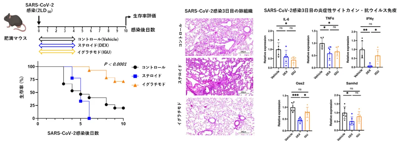 これまでの研究で、同研究チームは、内臓脂肪の蓄積がSARS-CoV-2感染によるサイトカインの過剰産生(サイトカインストーム)[用語3]のリスクとなることを示してきました。本研究では、ウイルスに感染させた肥満マウスにイグラチモドを投与することで、生存率の改善だけでなく、肺組織の傷害を軽減し、炎症を抑えることを発見しました。