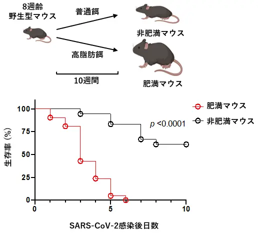 研究チームは、これまでに野生型マウスに高脂肪食を長期間与えることで肥満化させたマウスが、SARS-CoV-2感染後に早期死亡することを見出していました(図2)。SARS-CoV-2の感染から3日後の肥満マウスの肺では、広範な肺炎が確認され、SARS-CoV-2タンパクも多く検出されました。また、TNFα(腫瘍壊死因子α)[用語6]やIL-6などの炎症性サイトカインも著しく上昇しており、サイトカインストームの状態であると判断されました。これらのことから、本モデルは重症COVID-19におけるサイトカインストームを再現しており、薬剤の有効性を検討するために適していると考えました。