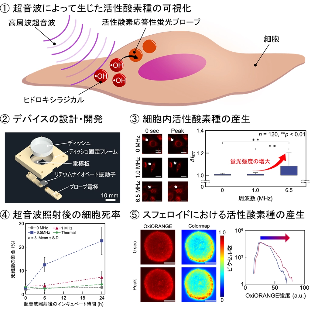 本研究では、リチウムナイオベート振動子を用いて高周波の超音波を照射することで細胞内に活性酸素種を産生する手法を開発しました。具体的には、リチウムナイオベート振動子を作動させることで6.5 MHzの高周波超音波を細胞に照射するデバイスを製作しました。製作したデバイスを用いて6.5 MHzの高周波超音波を細胞に照射することで細胞内に活性酸素種の一つであるヒドロキシラジカルを産生することに成功しました。続いて、超音波照射後の細胞死の割合の時間変化を測定することで、細胞内で産生した活性酸素種が細胞死に与える影響を評価しました。その結果、本研究の提案手法は細胞死を誘導することが確認されました。さらに、三次元細胞組織に高周波の超音波を照射したときの、活性酸素種の産生を可視化しました。具体的には、三次元細胞組織の一つであるスフェロイド[用語2]に6.5 MHzの超音波を照射することで、スフェロイドで活性酸素種を産生させることに成功しました。このことから、リチウムナイオベート振動子によって照射される高周波の超音波が細胞内で活性酸素種を産生することを実証しました。