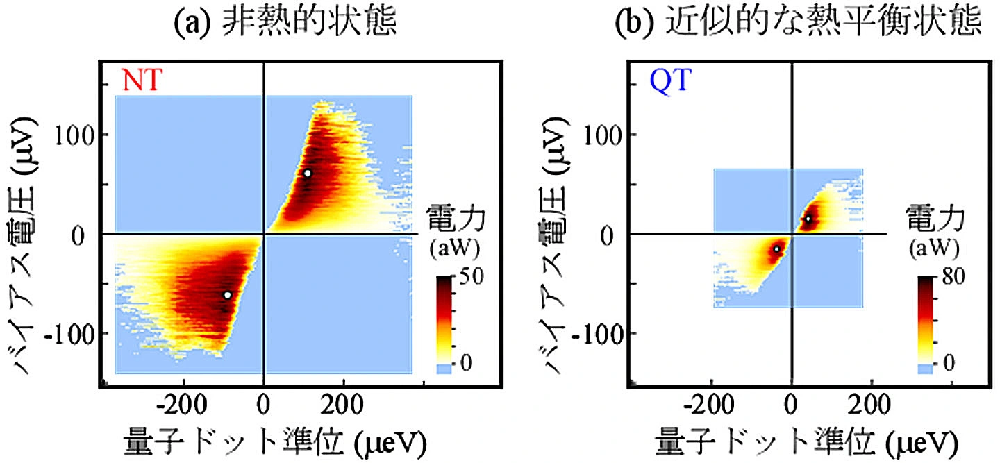 - カーゾン・アールボーン効率(Curzon-Ahlborn efficiency):早く仕事を取り出す(取り出す電力を大きくする)と、温度勾配の発生などにより熱効率は低下する。電力を最大にした場合の熱効率をカーゾン・アールボーン効率と呼び、高温熱源(温度TH)と低温熱源(温度TL)に対するカーゾン・アールボーン効率は、ηCA = 1 – (TL/TH)1/2で与えられる。本研究では、近似的な熱平衡状態に対する最大電力時の熱効率がカーゾン・アールボーン効率に近いことを確認した上で、非熱的状態に対する最大電力時の熱効率がそれを上回ることを示した。
