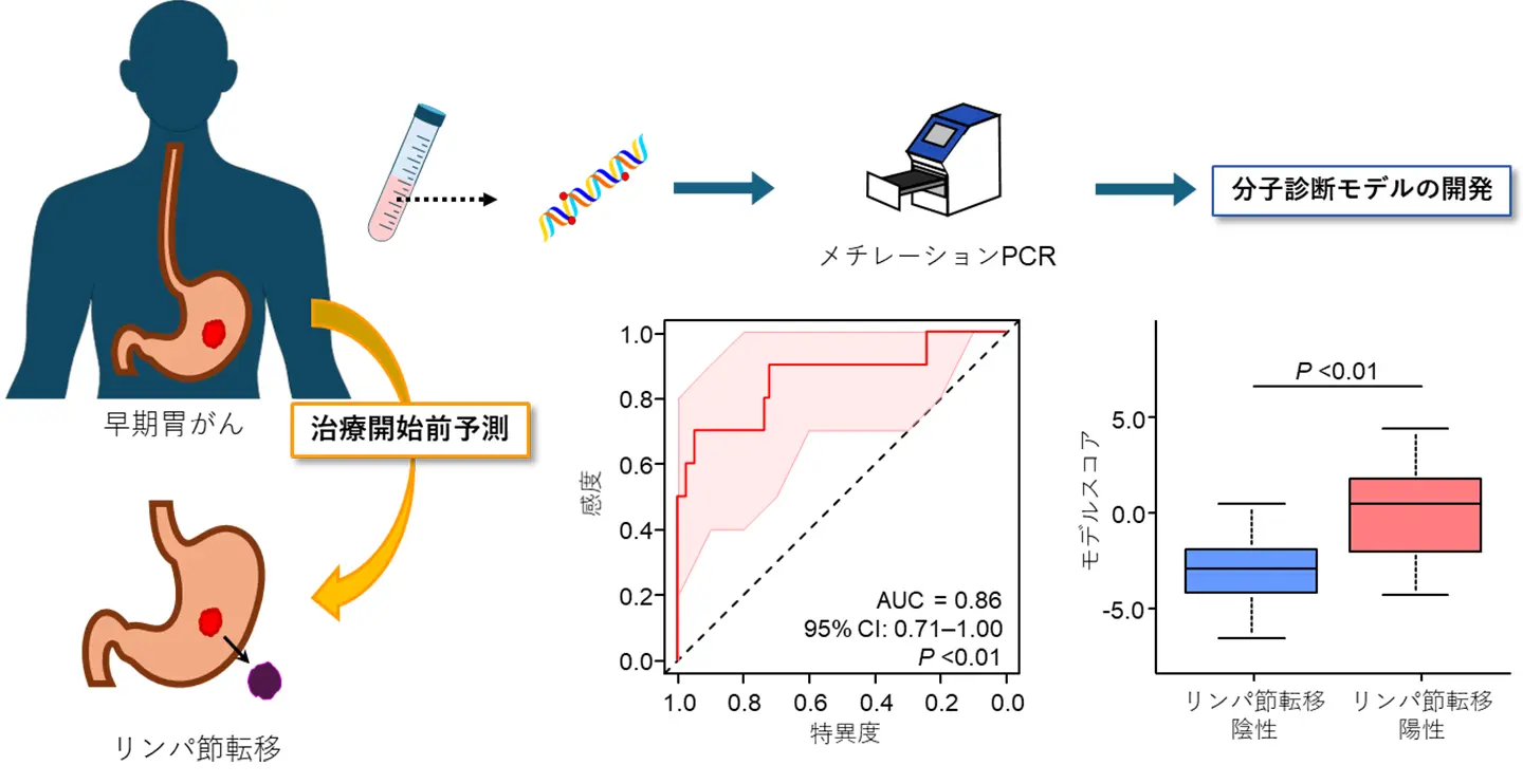 - 本研究では、血液中のDNAメチル化レベルを解析し、治療前に早期胃がんのリンパ節転移リスクを予測できる分子診断モデルを開発しました。