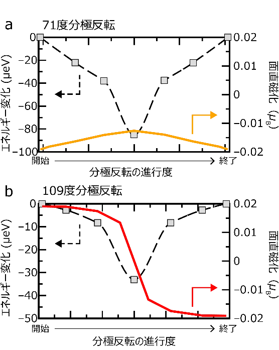 さらに研究グループは第一原理計算[用語9]によって、分極反転の最中の結晶構造の変化を調べ、薄膜表面に平行に電場を印加した際に生じる面直成分(面直磁化)の反転の可能性を、71度と109度分極反転の2つのケースで比較しました。それぞれのケースについて、分極反転の開始から終了までの間のエネルギー変化(左軸)と面直磁化の大きさ(右軸)を求めたところ、71度分極反転では、面直磁化の符号が開始時と終了時で変わらず、磁化反転しませんでした(図3a)。一方、109度分極反転では、開始時と終了時で符号が反転しました(図3b)。このことから、電場による分極反転角度の違いが磁化反転の方向に強く関係することが明らかになりました。