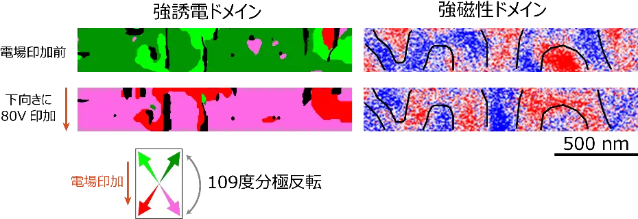次に、この109度の分極反転に伴う、強誘電ドメインと強磁性ドメイン構造の変化を観察しました。まず強誘電ドメイン像では、(110)面に含まれる4つの分極方向が分かるように着色すると、電場印加の前後では、濃い緑の領域がピンクに、薄い緑の領域が赤に変化しました(図2左)。これはまさに109度分極反転に対応するものです。さらに強磁性ドメイン像では、磁化の面直成分が逆向きの領域を赤色と青色で示したところ、電場印加の反転前後によって、ドメインの境界線の形がほとんど変化せずに、赤と青の色が反転している様子が確認されました(図2右)。これは、薄膜表面に平行に電場を印加した場合、薄膜の垂直方向の磁化が反転することを実験的に示す結果です。