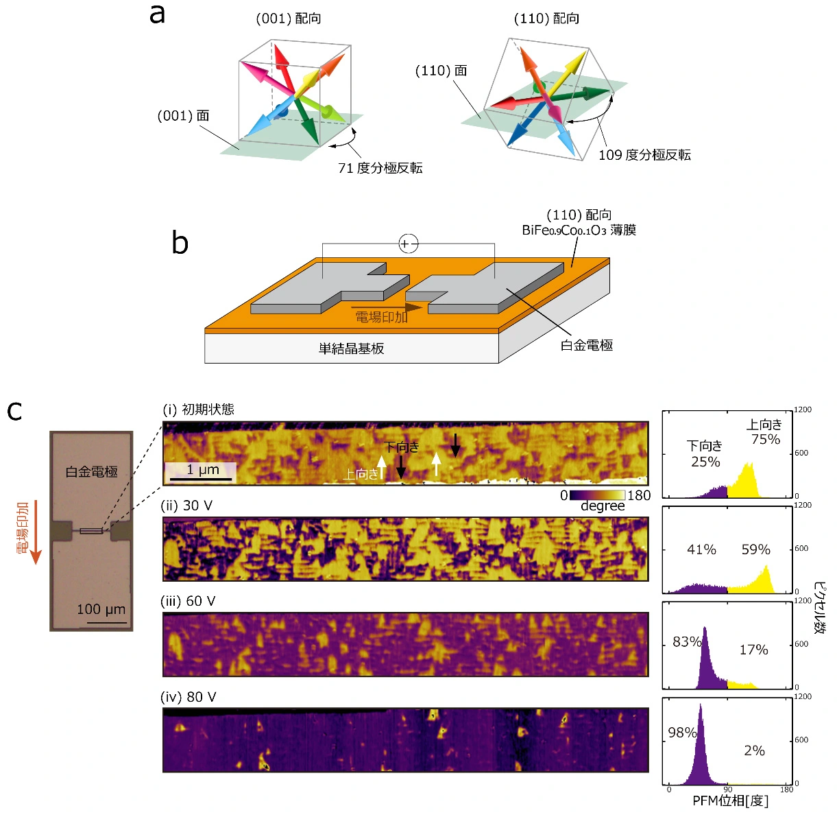 今回は、この109度分極反転を引き起こすことを狙って、(110)配向膜上に白金電極を配置した構造を作製しました(図1b)。この電極に電場を印加したところ、強誘電ドメイン[用語8]の分布の変化が観測されました(図1c)。分極分布を示すPFM位相のヒストグラムでは、印加電圧の上昇に伴って、上向き・下向きの電気分極を示す黄色と紫色の割合が全体的に変化していたことから、狙い通りの分極反転が実現したことが確認できました。