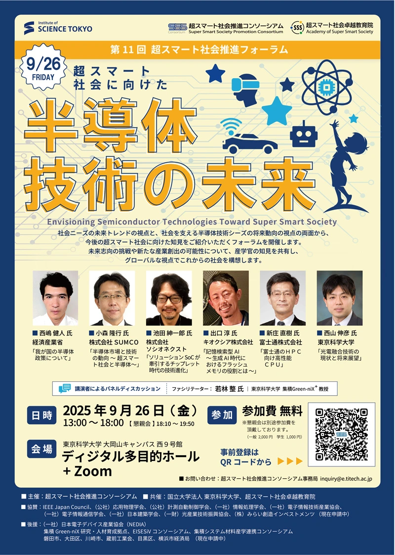東京科学大学(Science Tokyo)超スマート社会卓越教育院・超スマート社会推進コンソーシアムでは、「超スマート社会に向けた半導体技術の未来」と題し、社会ニーズとその未来トレンドの視点と、それを支える技術シーズとその産業動向の視点の両面から今後の超スマート社会に向けた知見をご紹介いただくフォーラムを開催します。ここではさらに未来志向の挑戦や新たな産業創出の可能性について、産学官の知見を共有し、グローバルな視点でこれからの社会を構想します。