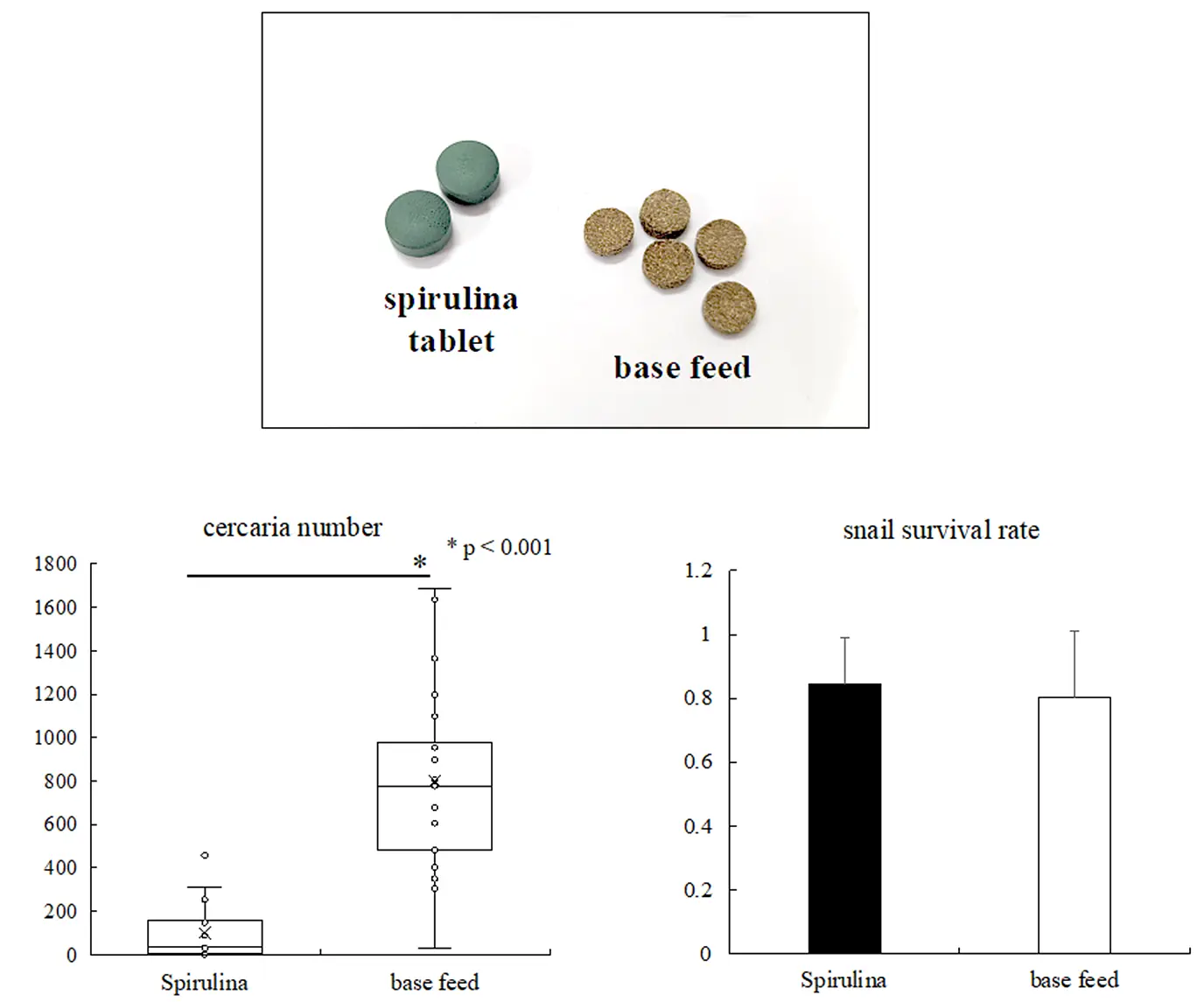 本研究では、中間宿主であるBiomphalaria glabrataにマンソン住血吸虫(Schistosoma mansoni)のミラシジウム幼虫を感染させた後、感染初日からスピルリナを含む飼料または基本飼料(図1)を週2回、200mgずつ、6週間にわたって摂食させる実験を行いました。