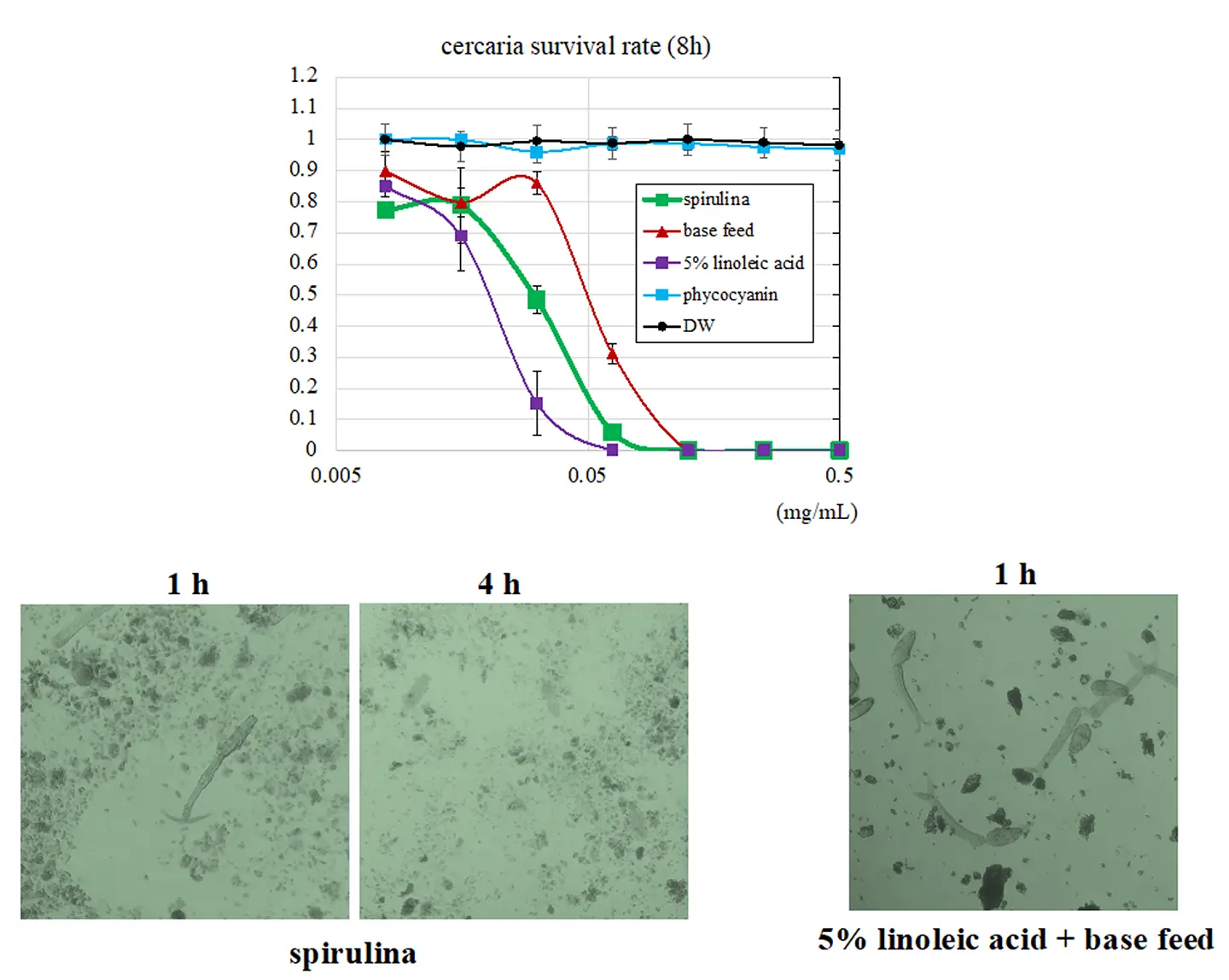 そこで、スピルリナ飼料および基本飼料に含まれる脂肪酸成分を分析した結果、両飼料にリノール酸が多く含まれていることが確認されました。次に、リノール酸を添加した基本飼料を作成し、セルカリアへの影響を評価したところ、リノール酸混合飼料は強い殺滅効果を示しました。