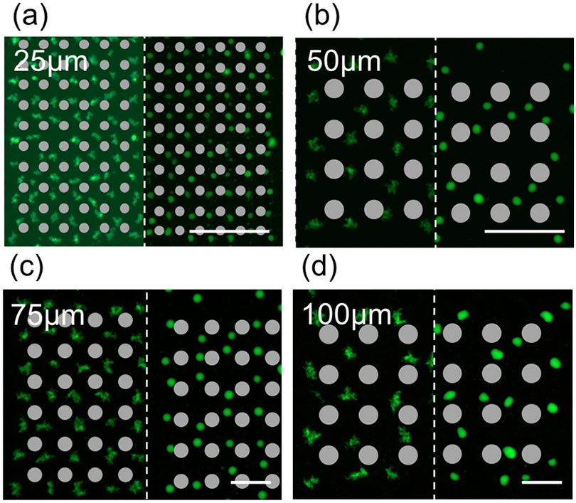 (c, d) マイクロピラー配列とDNA凝集体(緑)をそれぞれ示す、明視野観察と蛍光観察の合成画像。スケールバー = 100 µm。