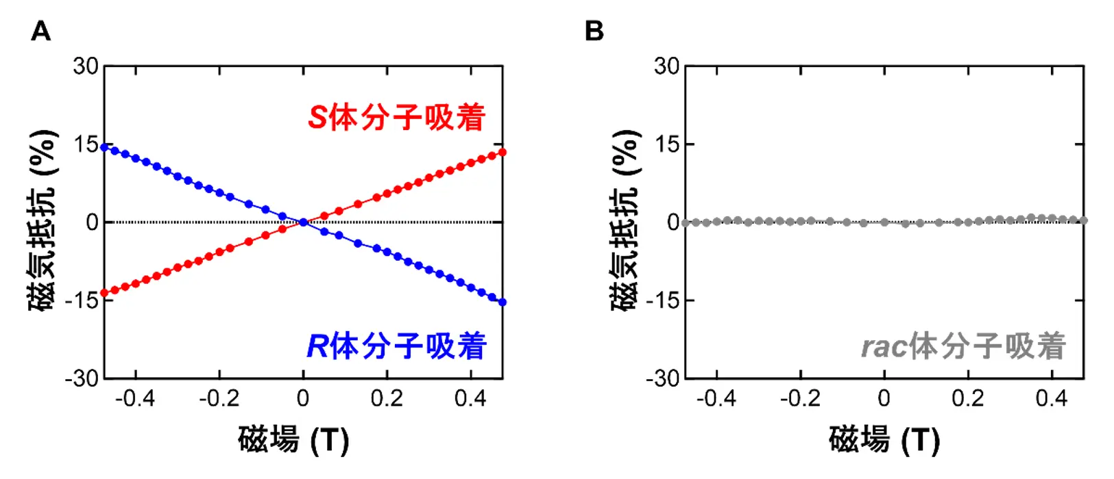 このようにして得られた界面の金属状態を調べるため、その電気伝導特性を詳細に測定しました。その結果、キラリティに対応して一方のスピンを持つ電子のみが選択的に透過するキラリティ誘起スピン選択性(CISS、図2)が観測されました(図3)。さらに、外部磁場の印加下では、キラリティに応じて電流の流れやすい向きが反転する磁気キラル効果も確認され、半導体界面の電子状態にキラリティが誘起されていることが明らかになりました(図4)。