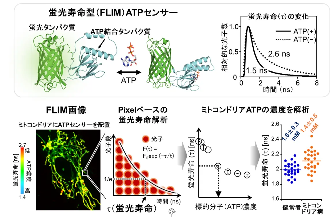 本研究グループは、従来の輝度変化の代わりに、細胞内の標的分子の濃度を蛍光寿命値に変換できる蛍光センサーを着想しました(図1)。蛍光寿命は、上記の輝度変化型センサーで課題となる複数の要因の影響を受けにくい、安定性の高い物理量です。ここで、蛍光寿命値と細胞内の標的分子の濃度情報と1対1で紐付けることができれば、信頼度の高い検量線を用いて細胞内の分子濃度を決定することが可能になります(図1 下段の検量線:X [ns]=Y [M])。本研究グループは、細胞内のATPの濃度を蛍光寿命に変換できる新しいバイオセンサーを作ることに成功しました。このセンサーにより、定量性が著しく向上したことで、さまざまな細胞種間のATP濃度を比較することが可能になりました。例えばミトコンドリア病では、ミトコンドリアの大事な機能の1つであるATP産生能に異常をきたしていることが予想されますが、実際、ミトコンドリア病患者では健常者の細胞に比較してミトコンドリアのATP濃度が低くなっていることが示唆されました(防衛医大との共同研究)。この差は0.3 mM程度とわずかですが、本センサーにより検出可能であることが実証されました(図1 下段)。