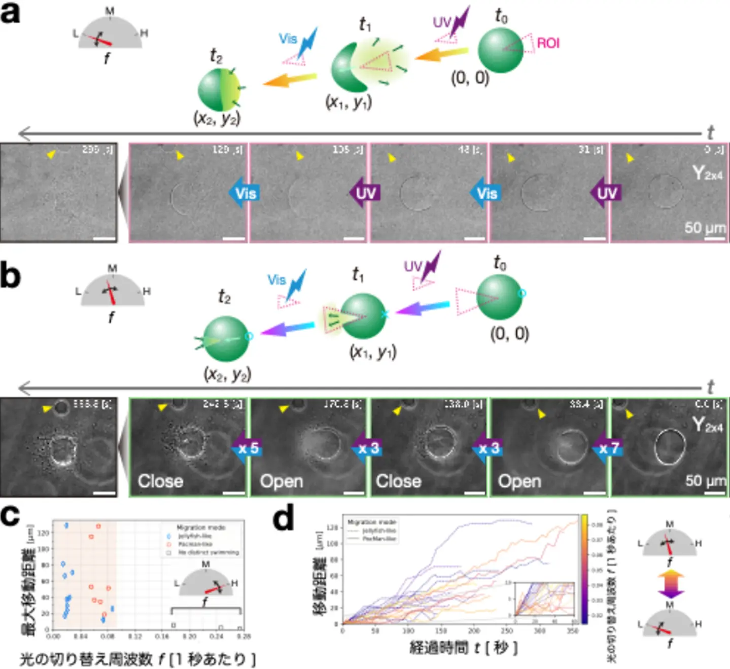 ここまでは、光をDNA凝集体よりも広い領域に照射していたため、対称的な流れ場が生じています。UV–可視光の切り替えでサイクルする流れ(図4e)を方向性のある駆動にするためには、非対称性を入れる必要があります。そこで、DNA液滴の一部だけに照射領域を限定する特殊な装置を使って、非対称的なマイクロ流れを作りました。また、波長の切り替え周波数(1秒あたりに何回切り替わるか)を幅広く調べて、その効果を調べました。切り替え周波数が低い場合には、照射領域とは反対側の方向に進むクラゲのような泳動が観察されました(図5a)。一方、より高い切り替え周波数では、照射領域と同じ側に向かって、パックマンのように口を開いたり閉じたりしながら進む泳動が見られました(図5b)。切り替え周波数に対して最大移動距離をプロットすると、特定の切り替え周波数を境に「クラゲ」泳動から「パックマン」泳動に切り替わることが判明しました。なお、極端に高い切り替え周波数では泳動が見られませんでした(図5c)。また、それぞれの泳動モードの時間発展をみると、「クラゲ」泳動は初め速く移動するが持続力が短いです。一方、「パックマン」泳動では、ステップあたりの移動幅は小さいが持続力があることが分かりました(図5d)。