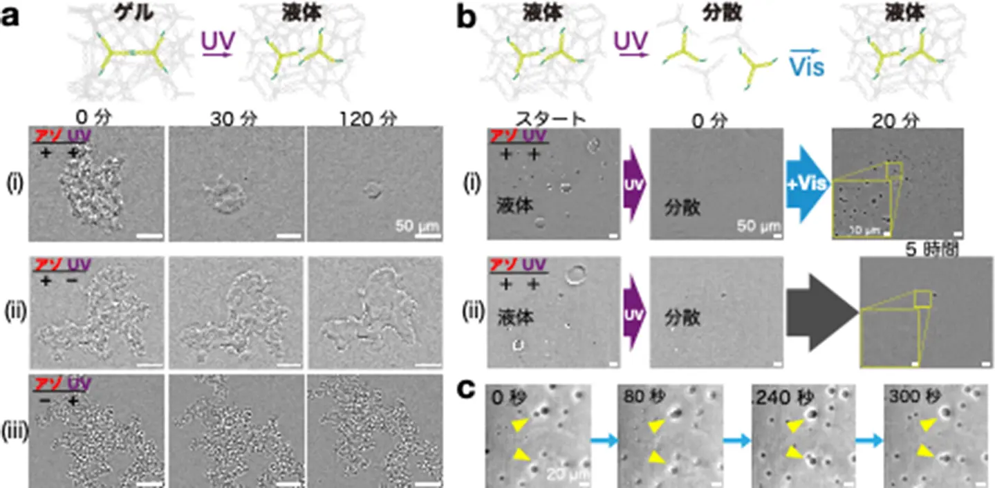 図3. 光でDNA凝集体の相状態を可逆的に変える。(a)UV照射の効果。アゾベンゼン修飾とUV照射の両方があるときだけ、スポンジ状の凝集体は丸くなる。流動性が増加し表面張力が現れる。(b)可視光の効果。UVで分散させた後に、可視光を当てると再び液滴が現れる。(c)可視光で再出現した液滴は互いに融合する。黄色のマーカーが指す粒子に注目。液体である証拠。