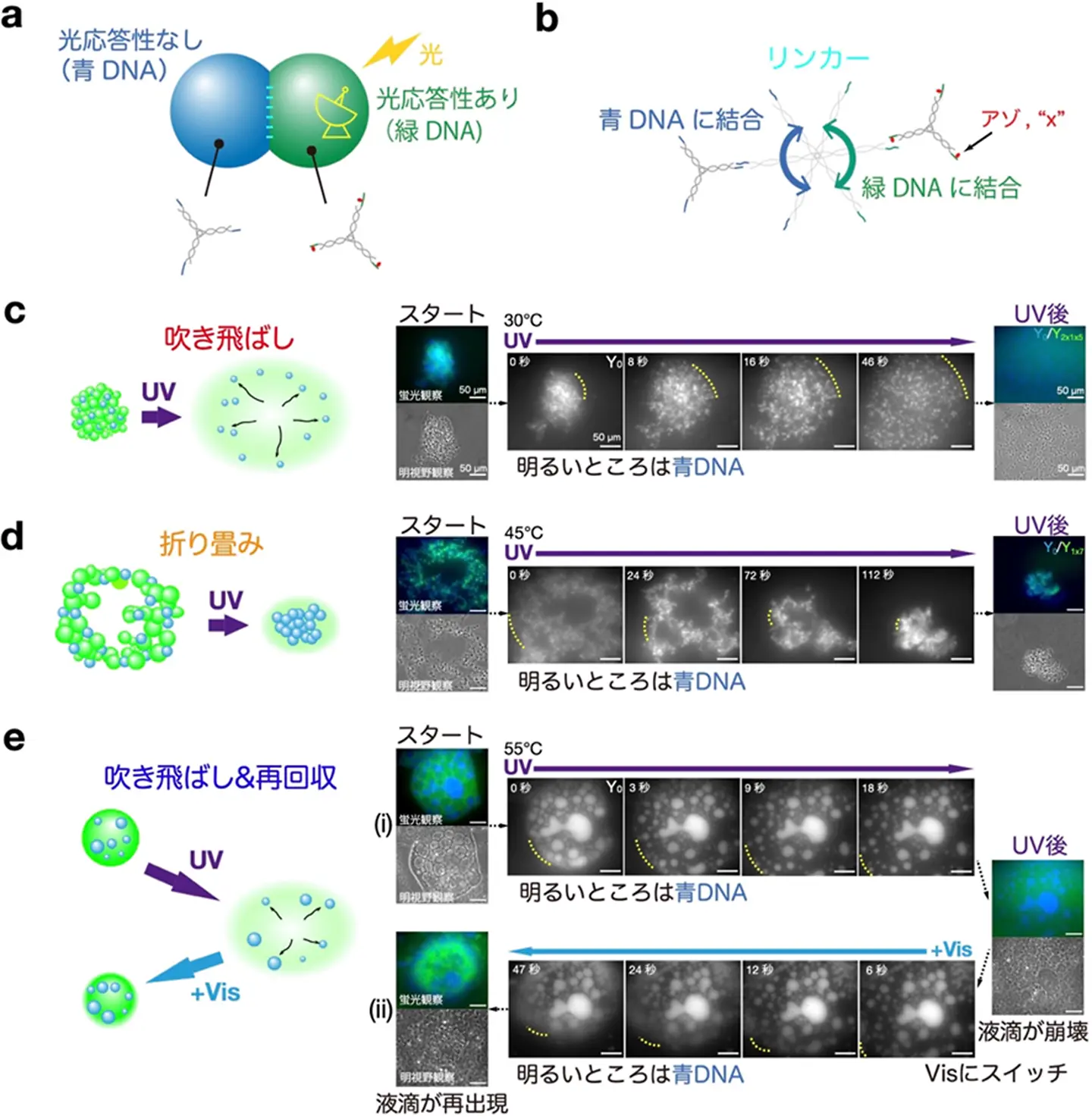 本研究ではまず、アゾベンゼン修飾モチーフから固いゲル状態のDNA凝集体を形成しました。これにUV光(365 nm)を照射すると、表面の凹凸がなくなり、なめらかな液滴へと変化しました(図3a(i)、(ii)、(iii)と比較)。これは流動性が高くなったためです。