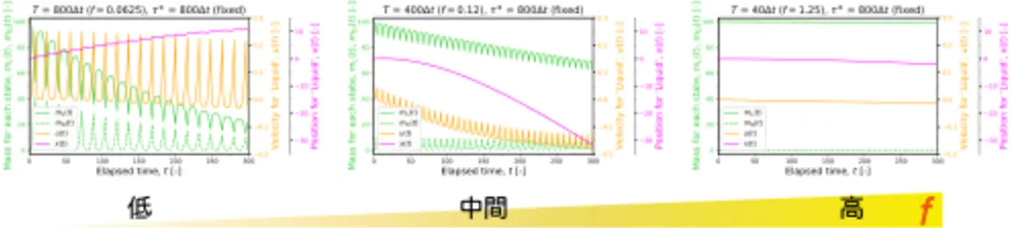 このことから、光の切り替え周波数が質量輸送にともなうエネルギーの散逸と交換のバランスを決めていることが明らかとなりました。エネルギーの散逸と交換のバランスが切り替わる周波数のしきい値 f をマイクロ流れの拡散係数から見積もったところ、 f ~ 0.07 [s -1]が得られました。この値は、「クラゲ」泳動と「パックマン」泳動が切り替わる周波数領域(図5c)と一致しています。