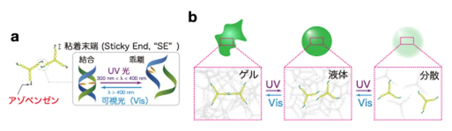 今回、「DNA液滴が遠隔操作によりマイクロ流れを実現する」ことをコンセプトとして、「精確で扱いやすい光照射により、DNA液滴が流動性を変えて流れ場を生じさせる」という挙動の実現を目指しました。DNAに光応答性を付与するために、光の波長に応じて立体構造を変化させてDNAの結合と乖離をスイッチングできるアゾベンゼンを、モチーフ分岐端のSEに修飾しました(図2a)。この光スイッチングにより、SEの結合と乖離を可逆的に切り替えることで、DNAの相分離凝集体の流動性を変化させることを基本的な制御原理としました(図2b)。