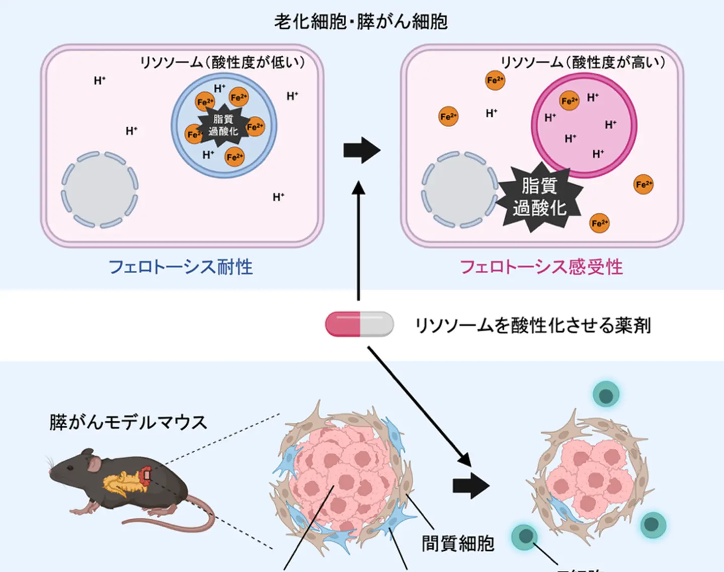 さらに本研究グループは、老化細胞と同様のリソソーム機能異常が膵臓がん細胞でも起こって、がん細胞のフェロトーシス抵抗性にも関与していることを見出しました。膵臓がんのモデルマウスを用いた実験で、リソソームの酸性化によって膵臓がんの発症やがん細胞の増殖を抑制できることを示しました(図)。本研究により、老化細胞におけるリソソーム機能障害とフェロトーシス抵抗性との関連が明らかになったことで、リソソームの酸性度を制御することが、がんを含む加齢関連疾患の新たな治療戦略となる可能性が示唆されました。