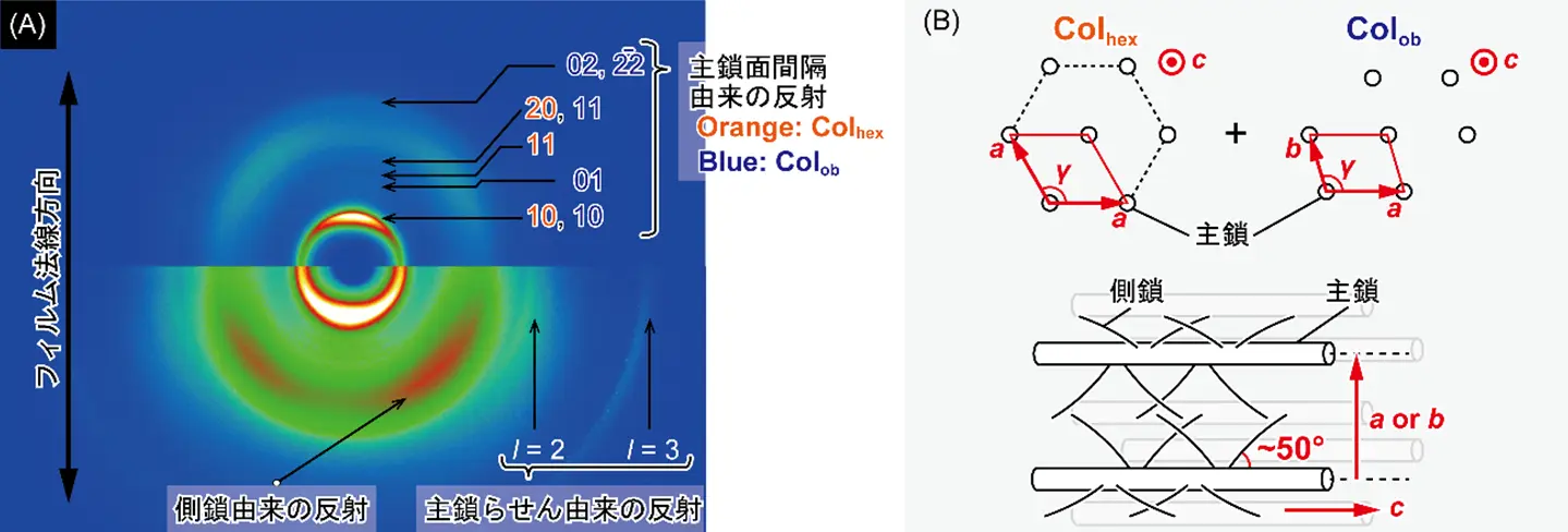 st-PMECMはPMEAと同種の側鎖を有するシンジオタクチックポリ置換メチレンです。シンジオタクチックポリ置換メチレンは全ての主鎖炭素に側鎖となる置換基を有し、その立体規則性[用語2]と高い側鎖密度によりらせんコンホメーションをとって剛直となった主鎖が自発的に一方向に並ぶことで、液晶性を発現します。