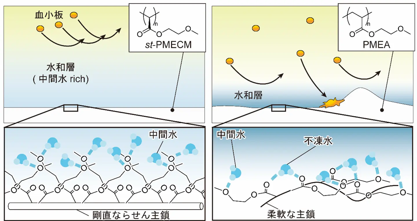 - st-PMECMでは、表面に高密度かつ安定に露出した側鎖末端のメトキシ基が水と相互作用して、抗血栓性に寄与する中間水を多く含む水和層を形成。