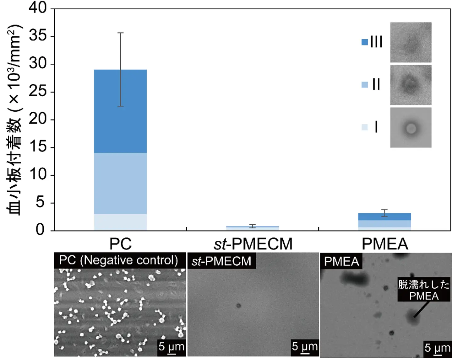 血小板付着試験では、st-PMECMの表面に付着した血小板数がPMEAの約4分の1となり、そのうえ付着血小板の約75%が最も活性化度の低い球状形態に留まるという、非常に優れた抗血栓性を示しました(図1)。さらに、液体状ポリマーであるPMEAでは脱濡れが観察されたのに対して、液晶構造をとって固体状ポリマーになるst-PMECMは脱濡れが生じない高いコーティング安定性を実現しました。