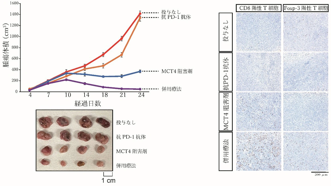 MCT4阻害剤の単独投与でも治療効果が認められるが、抗PD-1抗体との併用により、さらなる抗腫瘍効果が得られる。