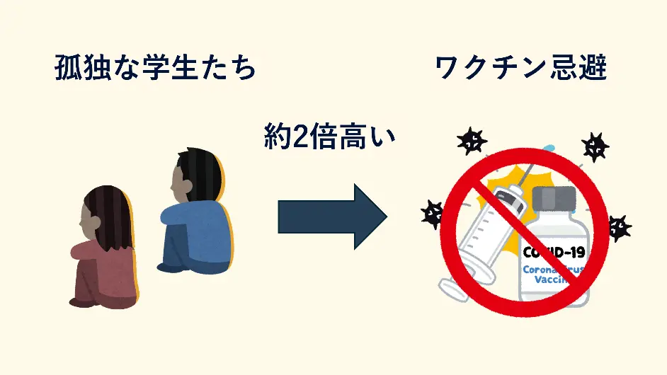 - 孤独を抱える学生は、そうでない学生に比べて約2倍の確率でワクチン接種をためらう傾向がありました(年齢・性別・健康状態などを統計的に調整後も有意)。
